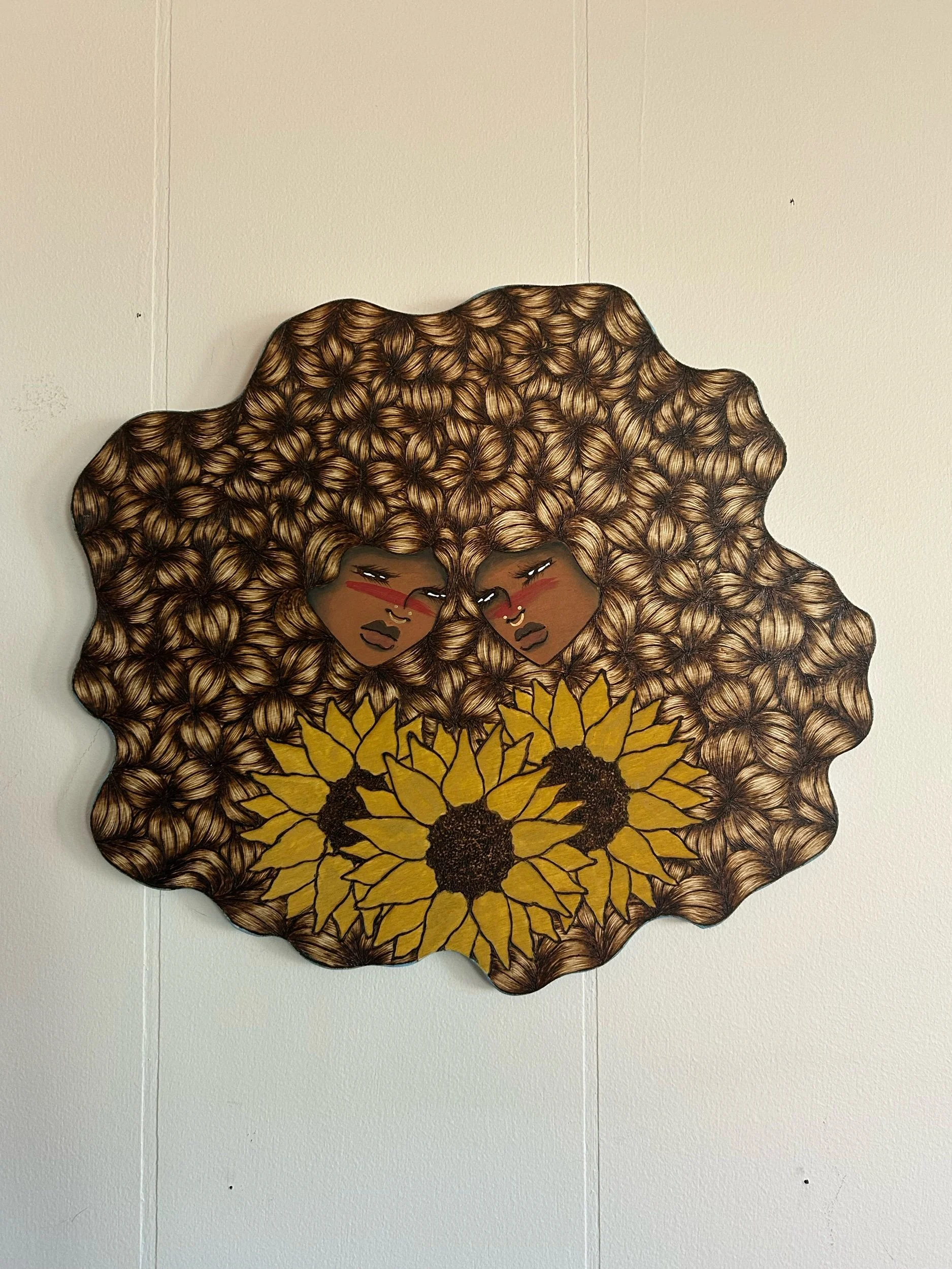 SHOP ONLINE › “The Protectors” - Sunflowers Image 1 of 1 “The Protectors” - Sunflowers $250.00 2026 pyrography and acrylic on woodApproximately 13” x 14”Ships within 5-7 business days Add To Cart Added! 2026 pyrography and acrylic on woodApproximately 13” x 14”Ships within 5-7 business days