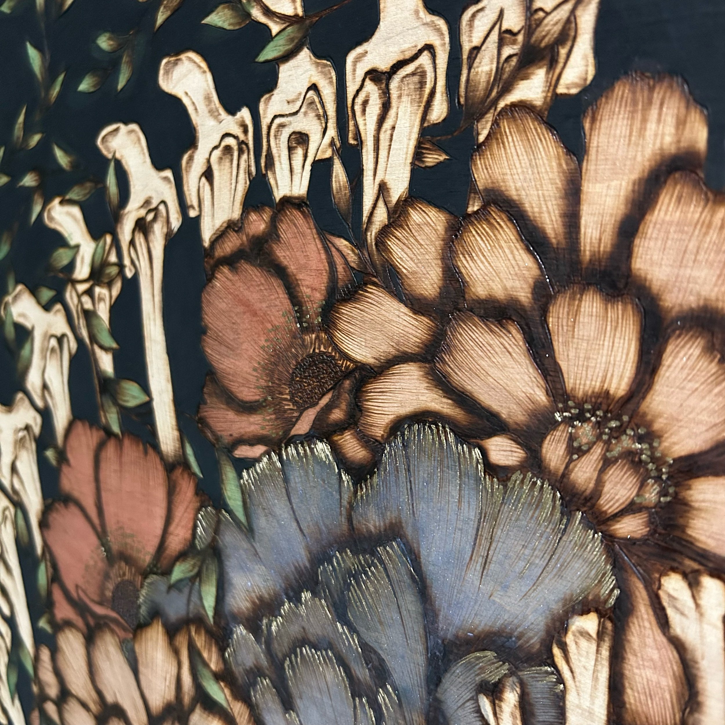 Pyrography & Acrylic on wood panel with brass embellishments