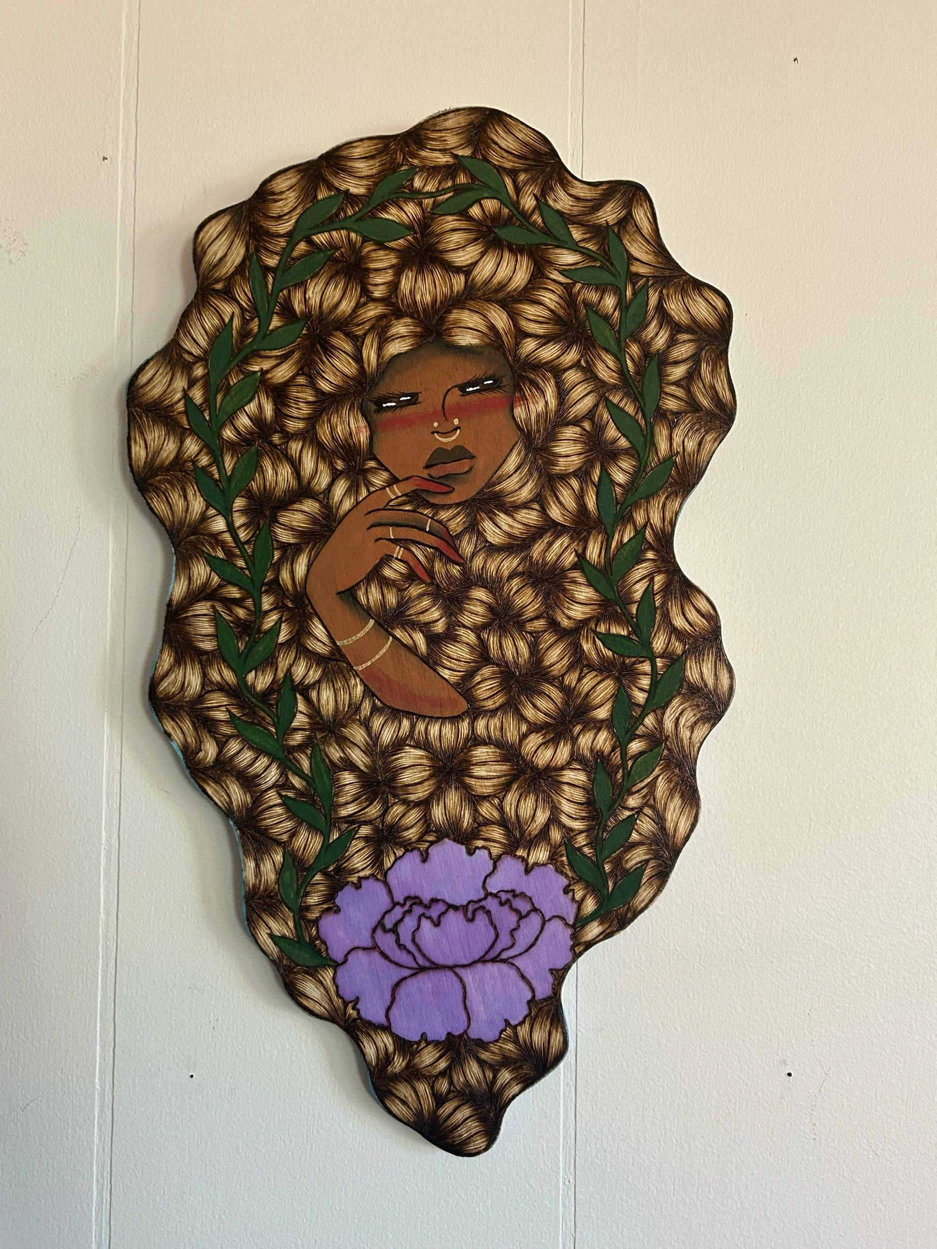 SHOP ONLINE › “The Protectors” - Purple Flower Image 1 of 1 “The Protectors” - Purple Flower $250.00 2026 pyrography and acrylic on woodApproximately 18” x 10”Ships within 5-7 business days Add To Cart Added! 2026 pyrography and acrylic on woodApproximately 18” x 10”Ships within 5-7 business days